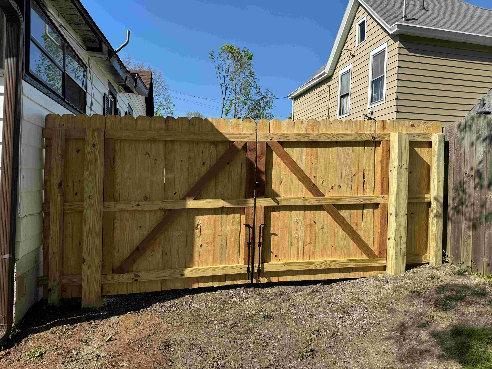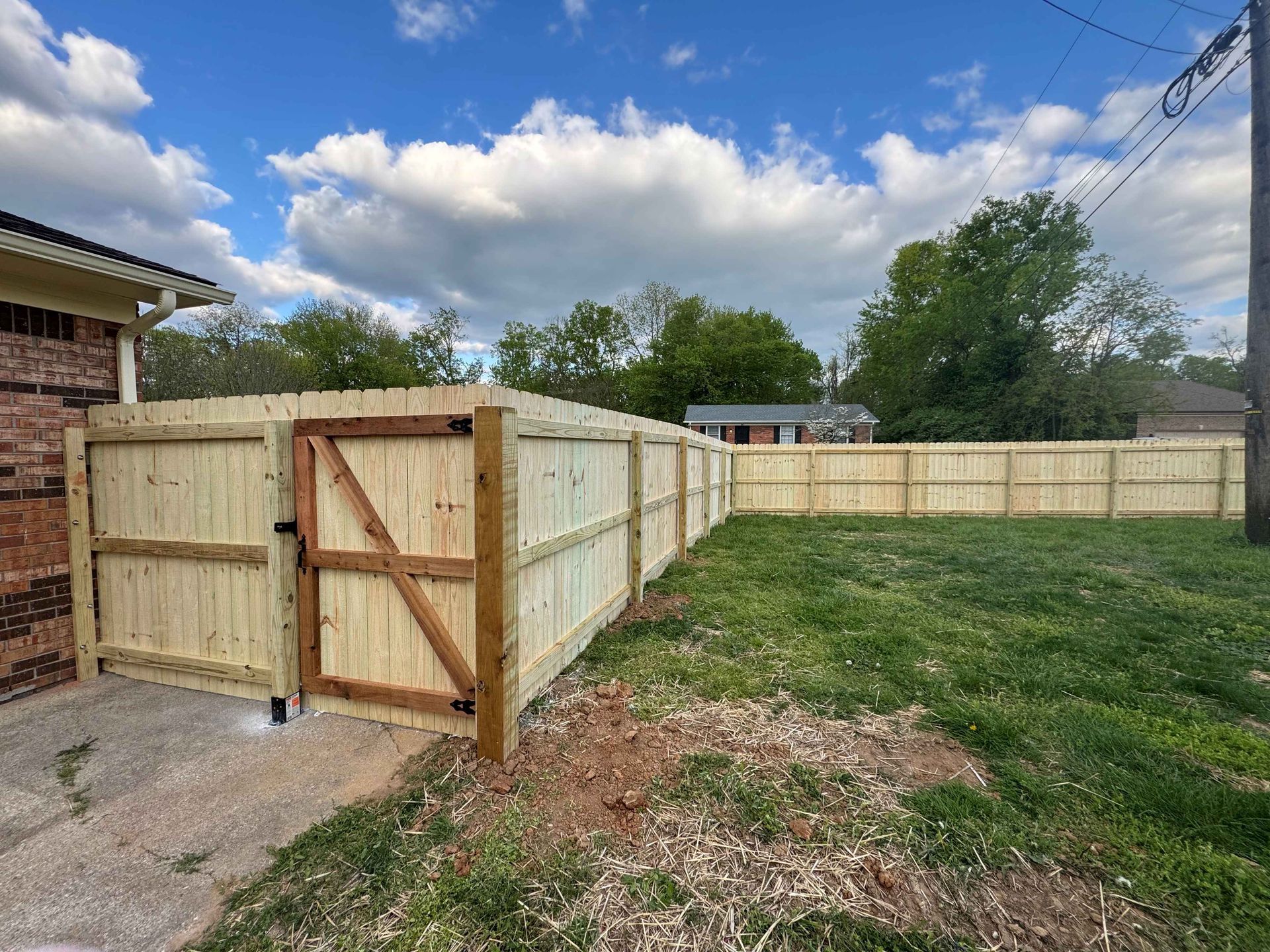 a wooden fence with a gate is sitting next to a brick building — Lexington, KY — Chafin Fence LLC