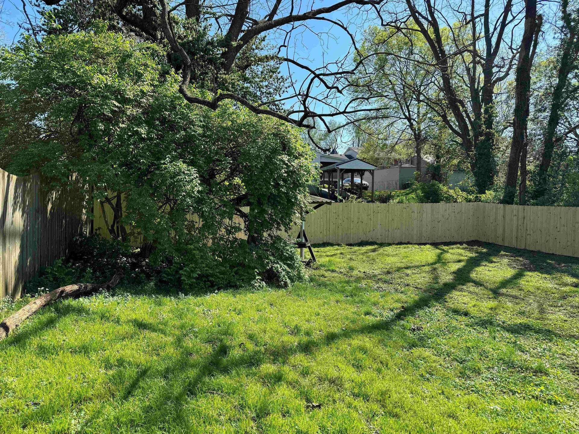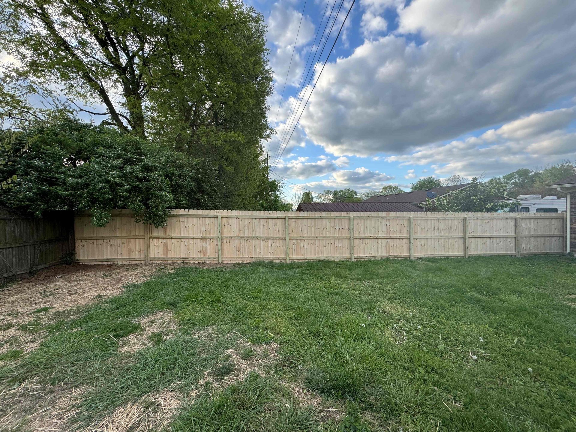 A backyard with a wooden fence and houses in the background — Lexington, KY — Chafin Fence LLC