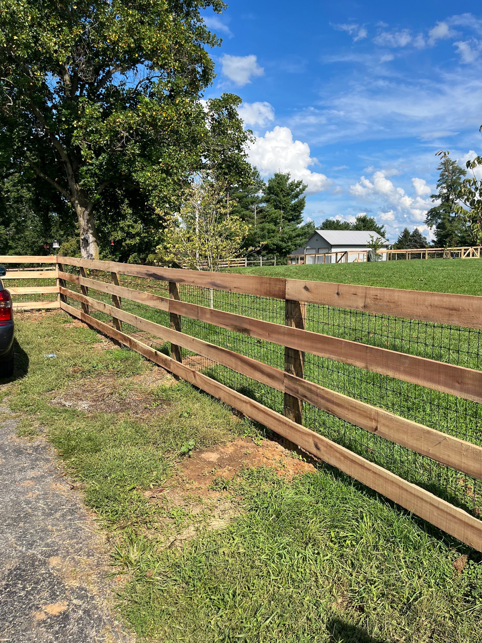 a wooden fence surrounds a grassy field next to a road — Lexington, KY — Chafin Fence LLC