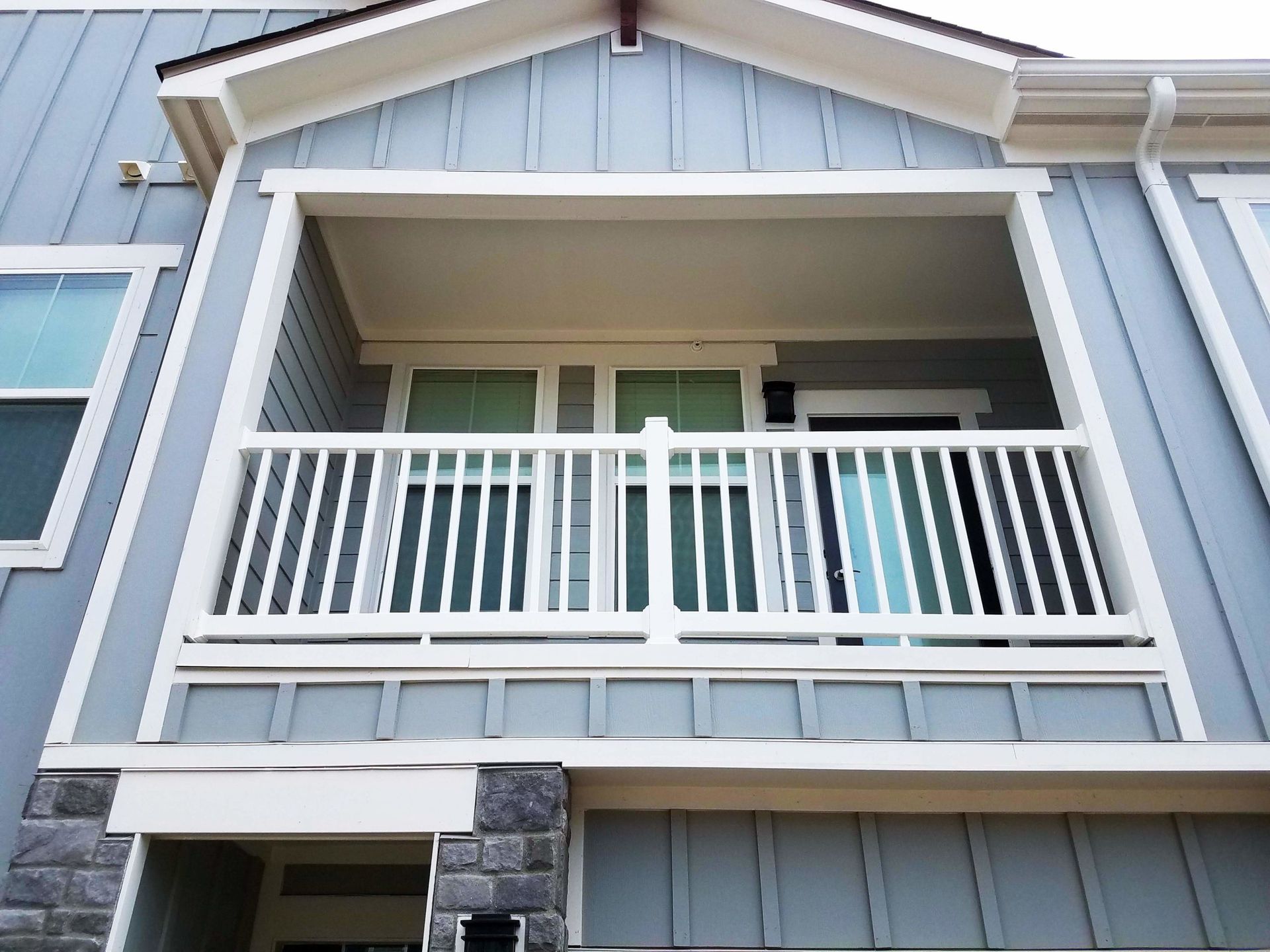 a brick porch with a metal railing and a bench — Lexington, KY — Chafin Fence LLC